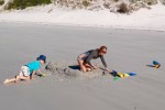 De Tasman peninsula staat bekend om de plek waar alle gevangenen in 1833 werden gedropt in de gevangenis van Port Arthur. Ook vonden we op het schiereiland een gin/wishkey distilleerderij en de Unzoo. Een plek waar ze proberen dieren in een vrijere omgeving te laten leven dan een dierentuin. Dit is de plek waar we ook de Tasmaanse duivels zagen en wat dichterbij kangoeroes konden komen. Vervolgens reden we via de hoofdstad, Hobart, helemaal door naar een eiland gelegen in het zuiden, Bruny Island. Waar we aankwamen toen het paasweekend begon. Gelukkig viel het op goede vrijdag nog mee hoeveel mensen er op het eiland waren en zo vonden we een mooie kampeerplek, die we alleen konden bereiken door 3km over het strand te rijden. Samen met een aantal andere Tasmaanse gezinnen deelden we de kampeergrond vlakbij de zee. Zo ontmoeten we Alan, Kathrina en hun kinderen, die naast ons stonden en het hele weekend er zouden genieten van de natuur, het vissen en het surfen. De dag dat we aankwamen hadden ze een lokale vis, flathead, gevangen die ze heerlijk hadden klaar gemaakt en met ons deelden. De volgende ochtend voor ons vertrek kregen we nog paaseitjes en tekeningen van hun kinderen. En toen konden we natuurlijk niet weg voordat zij een rondje achterop hadden gezeten, wat ze geweldig vonden!