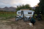 Die middag reden we door naar Hermanus, een fijn stadje aan de kust, om nog even te relaxen voordat we aan de tocht noordwaarts gingen beginnen. De volgende dag reden we langs Kaapstad richting het noorden naar Vredenburg waar we Nick ontmoetten. Een Zuid Afrikaan die ook motorrijder is en ons veel wist te vertellen over de weg naar en in Namibië. Ook kregen we van hem Tracks4Africa op onze GPS, een fijn navigatie programma die we in heel Afrika kunnen gebruiken. Helemaal up to date over de routes en wegen reden we via de kust door naar Cederberg. Hier sliepen we in een caravan op een ‘wine farm’. Jaja voor beiden de eerste nacht in een caravan, eens moet de eerste keer zijn en een leuke ervaring voor één keer! Vervolgens reden we verder door naar het noorden naar Springbok. Een stadje waar we nog even wat boodschappen konden halen voordat we de grens over gingen en gingen kamperen in de middle of nowhere. Bij de supermarkt ontmoetten we nog 3 andere Zuid Afrikaanse motorrijders, Angus, Eckehard en Jason, die ook hadden besloten om de volgende dag naar de zelfde grenspost te rijden. We spraken af om met elkaar de volgende avond een biertje te drinken op de campground, gezellig!