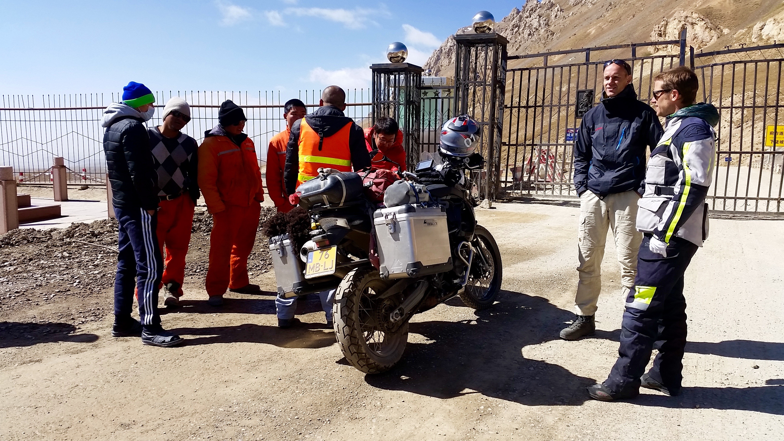 De gids stond bij de grens van niemandsland Kirgizië/China op ons te wachten, zodat hij ons kon helpen bij de Chinese grens met alle formaliteiten, echter deze grens lag nog ongeveer 150 km verderop. Dus op naar de Chinese grens, maar eerst nog 5 checkpoints te gaan. Ja als je door China wilt reizen gaat het niet over rozen… alles moet gecontroleerd worden en het liefst zo vaak mogelijk. De mensen bij de posten zijn erg vriendelijk, houden van een geintje en willen uiteraard een foto met je maken en natuurlijk ook met je motor. Na heel wat checkpoints, een douche van chloormix voor onze motoren (ja een speciale desinfectie was blijkbaar ook nodig) en de formaliteiten bij de grens, waren we uiteindelijk good to go om naar Kashgar te gaan!