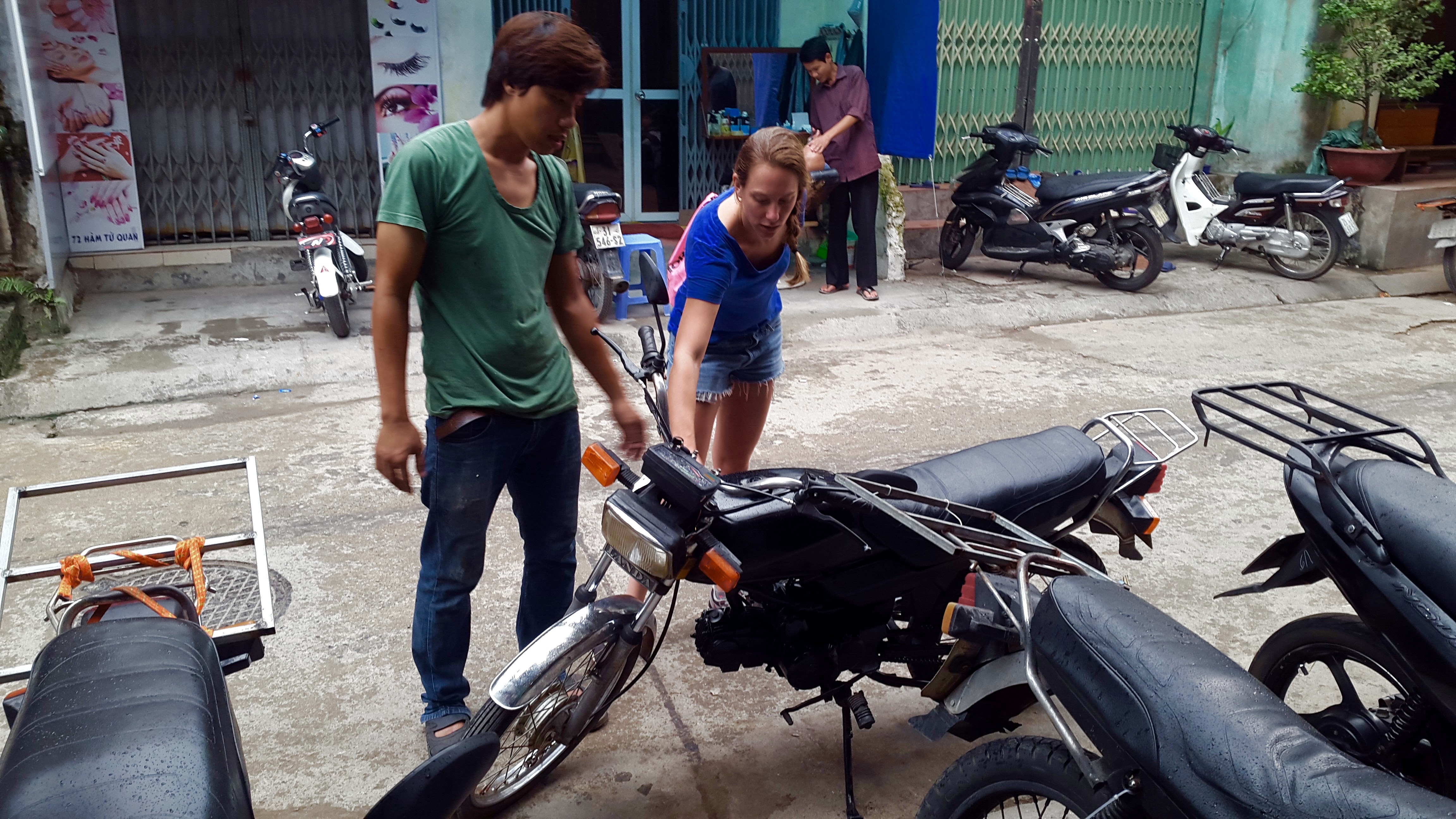 Verder niet heel interessant, Mui Ne, dus na 3 dagen in het water tijd om verder te gaan op de bastards. En niet zoals in de weken ervoor in het noorden, want Sinterklaas was langs geweest en die was de bastards niet vergeten! Landa had wel een bloemetje verdien en niet zo maar een. Een 10kg wegende lotusbloem uitgehouwen uit een mooi stuk steen. Een vrolijke decoratie die fijn mee achterop kon, al was de wegligging van Landa wel enigszins anders… En Stiglitz was ook mooi uitgedost, en wel met een bezemsteel met daaraan de Vietnamese vlag. Erg veel bekijks wat resulteerde in de nodige duimpjes onderweg. LIKE!