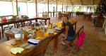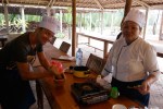 Een paar rondjes over de markt gevaren en daarna aan wal om ook de ‘normale’ markt te bezoeken. Alhoewel, echt normaal was het ook niet om op een nuchtere maag de onthoofde, gevelde kikkers te zien liggen die vanwege hun bijzondere zenuwstelsel nog heftige stuiptrekkingen liggen te maken. Een soort van kip die zonder kop nog vrolijk rondloopt, maar dan anders.